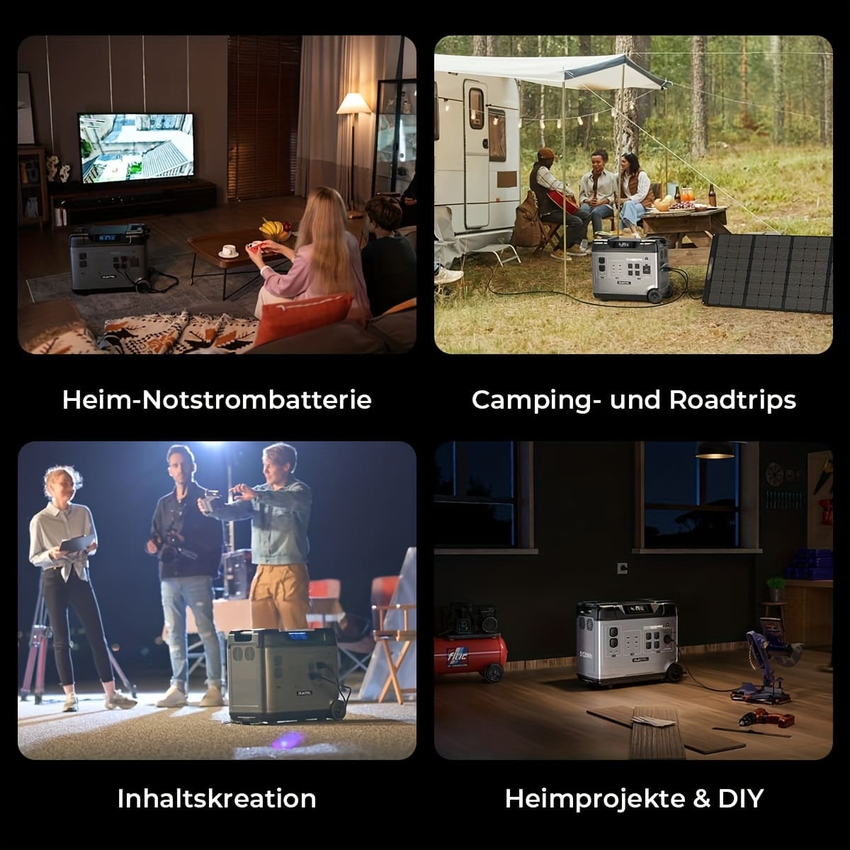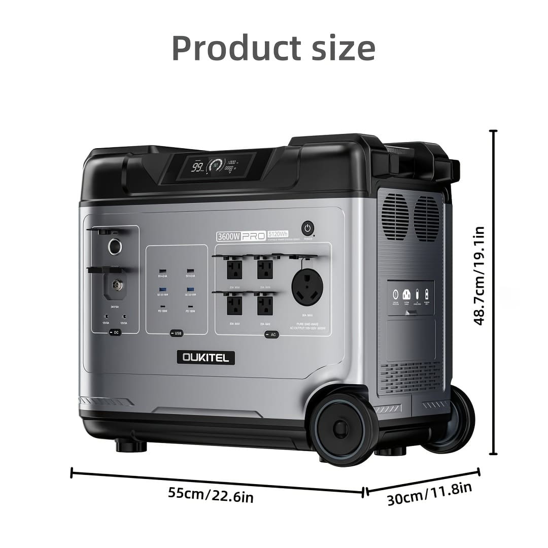 A professional 3600W portable power station with a huge 5120Wh LiFePO4 battery, dual-power backup, 30A/120V AC outlets, smart display, and quiet operation — ideal for home emergencies, RVs, and off-grid adventures.
